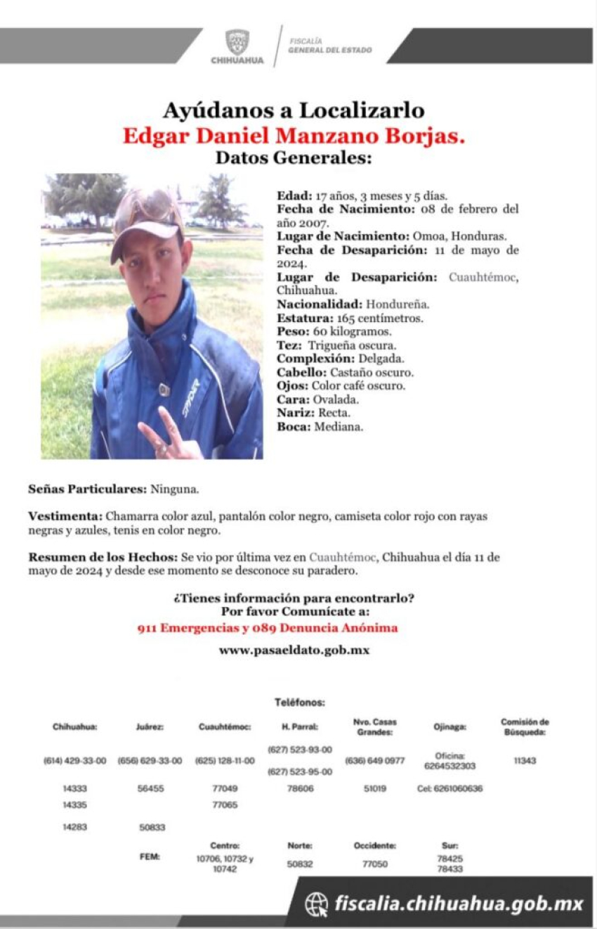 El reporte interpuesto por sus familiares, establece que el pasado viernes 10 de mayo, llegaron al municipio de Cuauhtémoc, las personas de nombres, Wilmer Alexis Montoya Díaz, de 38 años de edad, Edgar Daniel Manzano Borjas, de 17 años, y Hugo René Deras Pacheco, de 39 años de edad, en su travesía hacia los Estados Unidos.