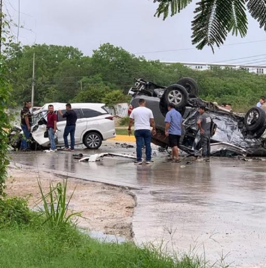 El accidente se presentó alrededor de las nueve de la mañana del martes en el bulevar Luis Donaldo Colosio, de Cancún, Quintana Roo. Esto cuando una camioneta gris perdió el control por el pavimento mojado, invadió el carril contrario y fue impactada por otro vehículo blanco, informaron medios de aquella ciudad.