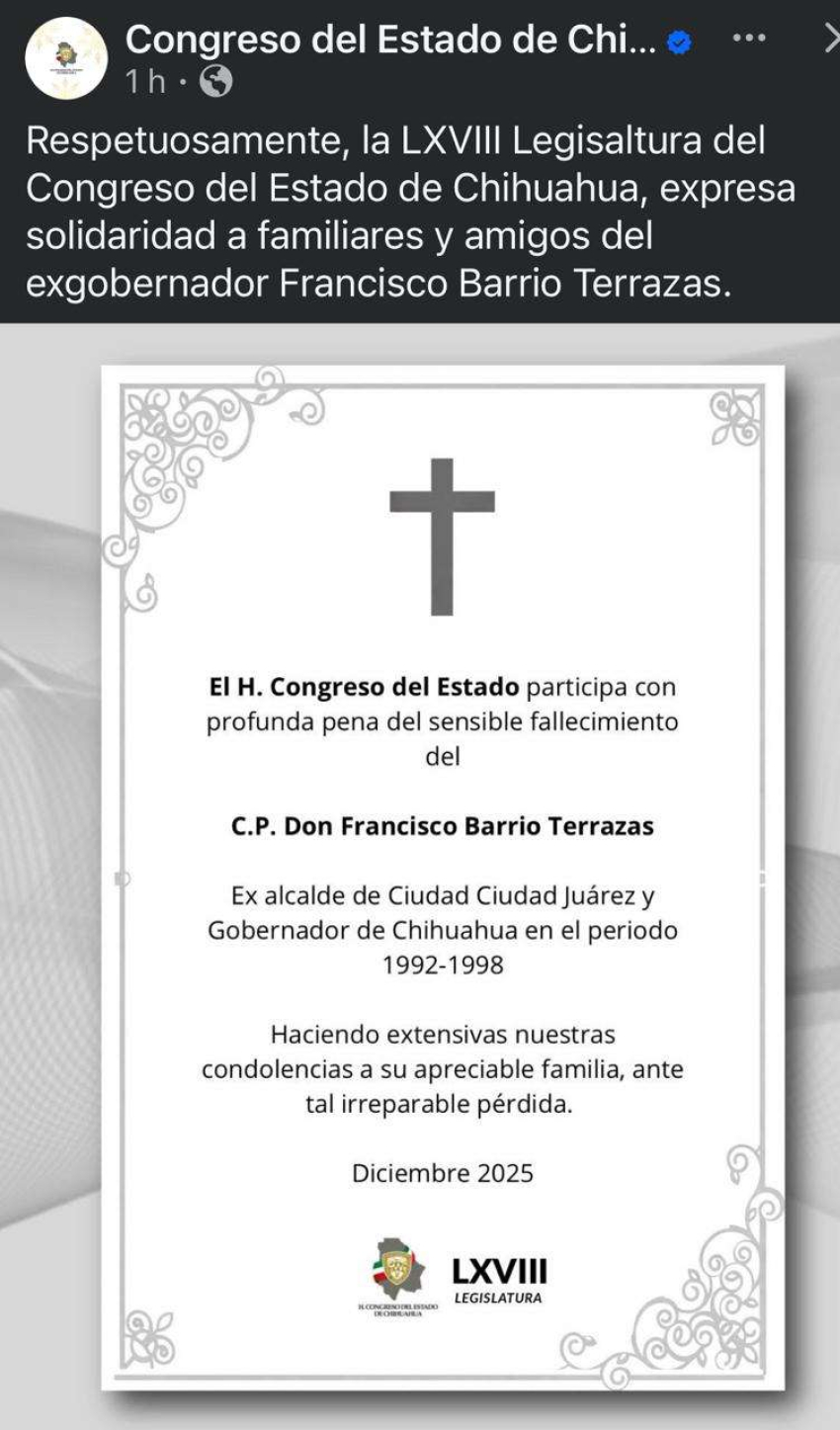 “El H. Congreso del Estado participa con profunda pena del sensible fallecimiento del C.P. Don Francisco Barrio Terrazas, exalcalde de Ciudad Juárez y gobernador de Chihuahua en el periodo 1992-1998”, cita el comunicado.